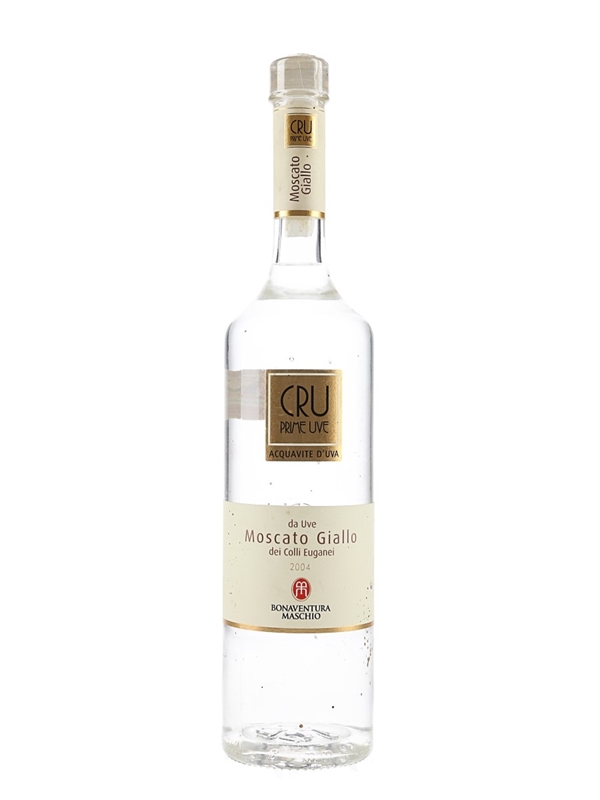 A bottle of Cru Prime Uve Moscato Giallo 2004 Acquavite d'Uva, a grape distillate produced at Distilleria Bonaventura Maschio in Gaiarine, Italy.