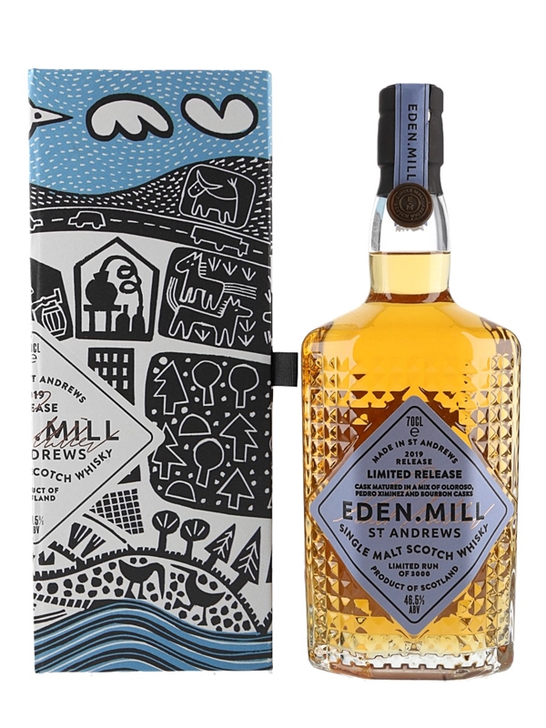 A bottle of Eden Mill single malt Scotch whisky produced in St Andrews. This was matured in a combination of Pedro Ximinez, oloroso and bourbon casks, and released in 2019.