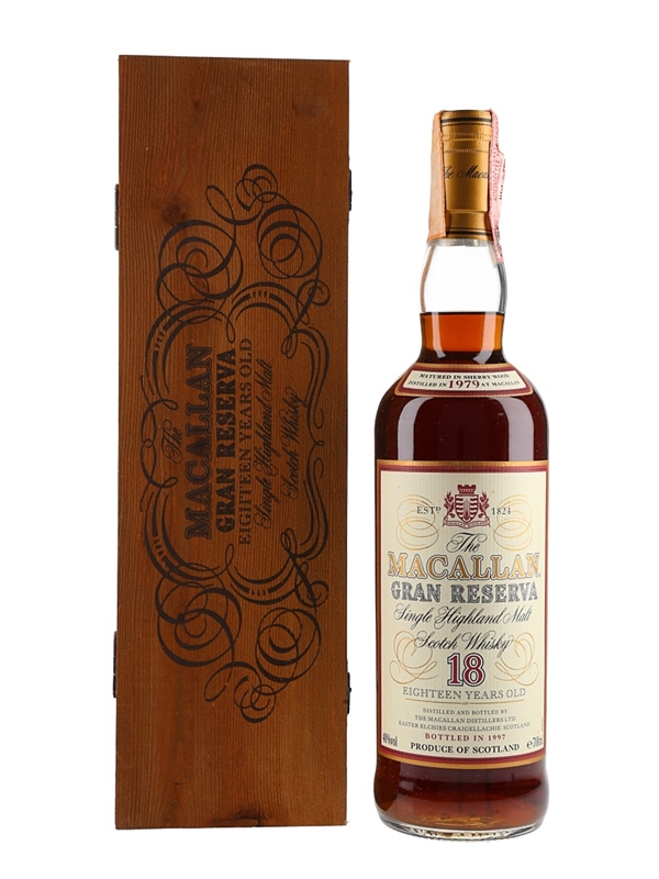 A bottle of The Macallan Gran Reserva 18 Year Old Single Highland Malt Scotch Whisky. This was distilled in 1979, matured in sherry casks and bottled in 1997.
