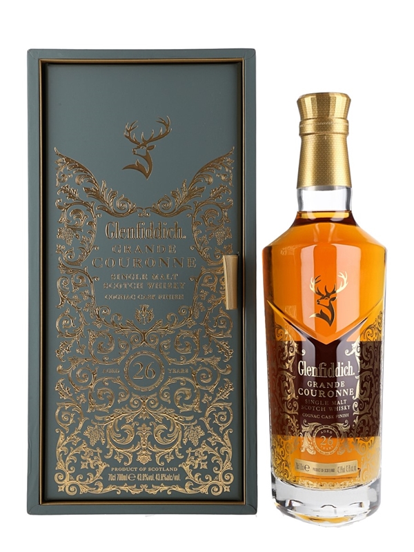 A bottle of Glenfiddich 26 Year Old Grande Couronne Single Malt Scotch Whisky, matured in American and European Oak casks before being finished for at least two years in Cognac casks. This was bottled at 43.8% ABV.