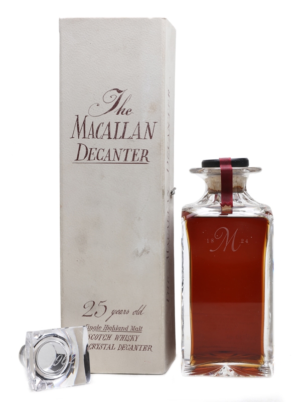 A hand-blown crystal decanter of Macallan 25 Year Old, distilled in 1962 and bottled in 1987. The decanter was produced by Tudor Crystal of Wordsley, Worcestershire, to an 18th century design.