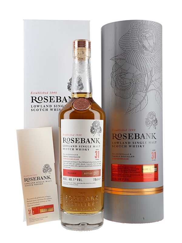 A bottle of Rosebank 31 Year Old Lowland Single Malt Scotch Whisky, Release 2, bottled in 2022.