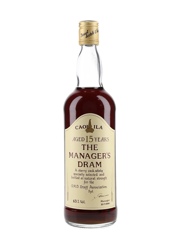 A bottle of Caol Ila 15 Year Old The Manager's Dram Single Malt Scotch Whisky. This was specially selected by Malt Distillery Managers within Diageo Distilling Ltd, and bottled at a natural cask strength of 63% ABV in 1990.