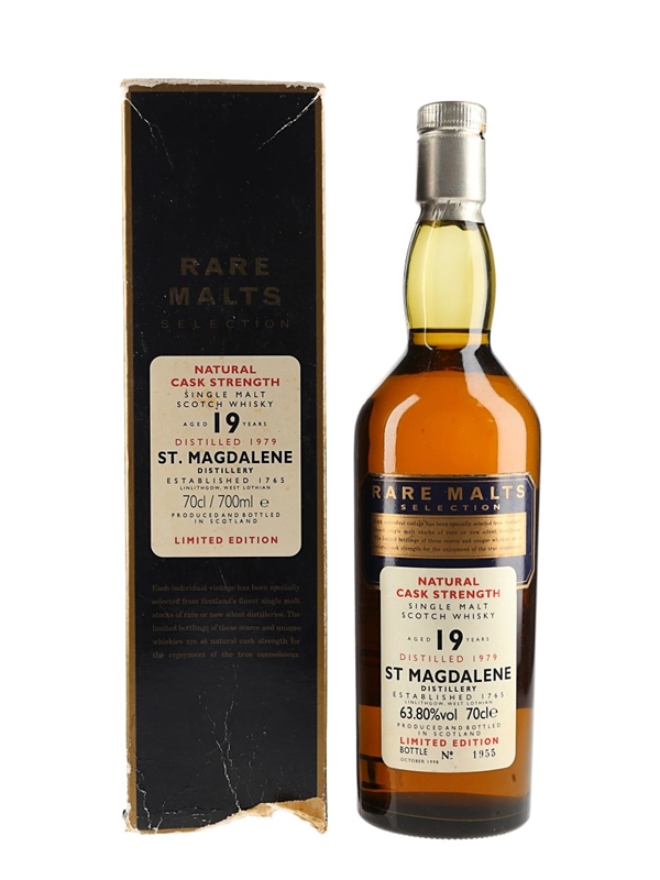 A bottle of St Magdalene 19 Year Old single malt Scotch whisky. This was distilled in 1979 and released in October 1998 as part of Diageo's now discontinued Rare Malts range.