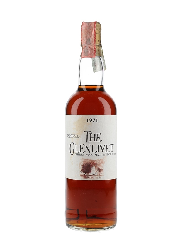 A bottle of The Glenlivet 1971 Sherry Wood Malt Scotch Whisky. This was distilled in 1971, matured in sherry wood cask before being bottled in 1993 by RW Duthie & Co. for Italian importer Samaroli.