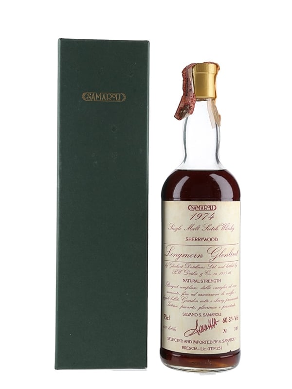 A bottle of Longmorn Glenlivet Single Malt Scotch Whisky. This was distilled in 1974, matured in sherry wood and bottled at natural strength in 1985 for Italian importer Samaroli.