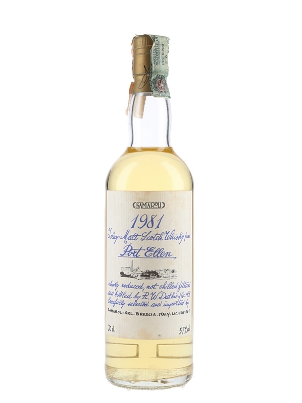 A bottle of Port Ellen Islay Malt Scotch Whisky. This was distilled in 1981 and bottled at 57% ABV by R W Duthie & Co., in 1991 as part of Handwritten Labels series .This was imported to Italy by Samaroli.