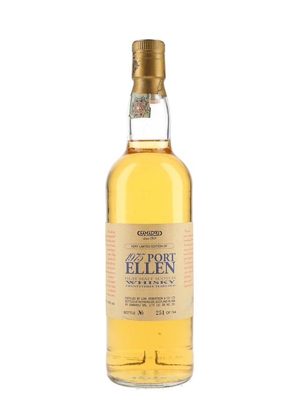 A bottle of Port Ellen 23 Year Old Islay Malt Scotch Whisky. This was distilled by Low Robertson & Co., in 1975 and bottled in 1998 by Italian importer Samaroli.