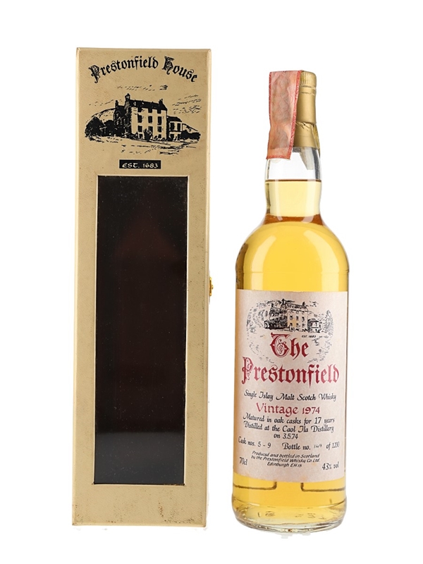 A bottle of Caol Ila Single Islay Malt Scotch Whisky. This was distilled on 3 May 1974, matured in oak casks for 17 years, and bottled at 43% ABV for Prestonfield House.