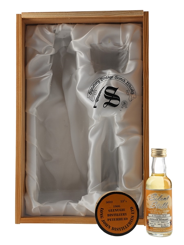 A miniature bottle of Glenugie 31 Year Old from Signatory's Silent Still series. This was distilled on 31 December 1966, matured in a single cask and bottled on 5 June 1998.