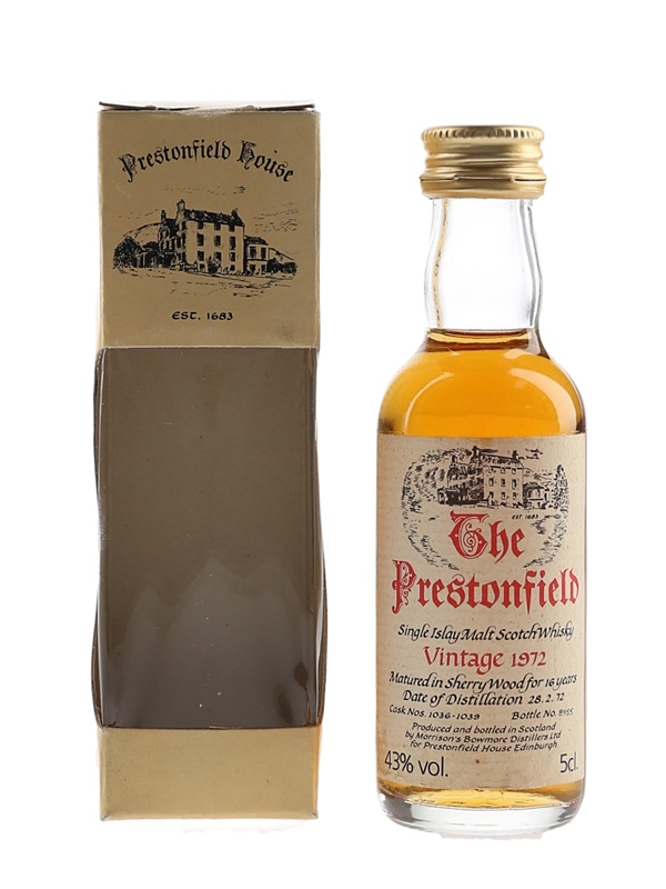A miniature bottle of The Prestonfield 1972 Single Islay Malt Scotch Whisky bottled by Morrison's Bowmore Distillers Ltd. for Prestonfield House, a five star boutique hotel in Edinburgh. This was distilled on 28 February 1972.