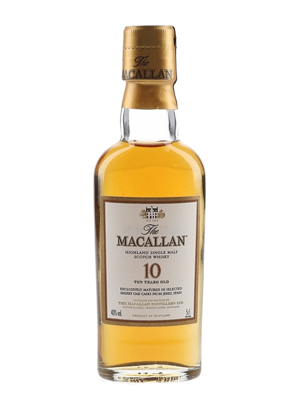 A miniature bottle of The Macallan 10 Year Old Single Highland Malt Scotch Whisky exclusively matured in selected sherry oak casks from Jerez, Spain.