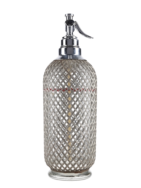 A sparklets soda siphon comprising of a glass bottle covered in wire mesh with pedestal base. This measures approximately 34cm tall.
