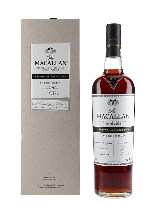 A bottle of The Macallan Highland Single Malt Scotch Whisky from the Exceptional Single Cask series. This was distilled on 13 October 1997, matured in a European oak first fill sherry hogshead and bottled on 27 November 2018.