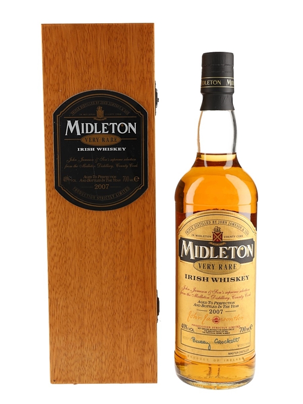 A bottle of Midleton Very Rare Irish Whiskey bottled in 2007. Every year since 1984, a new edition has been released in limited quantities. This comes in a wooden presentation box with a certificate of authenticity.