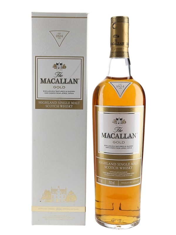 A bottle of The Macallan Gold Highland Single Malt Scotch Whisky, exclusively matured in sherry oak casks from Jerez, Spain, and bottled as part of The 1824 Series.