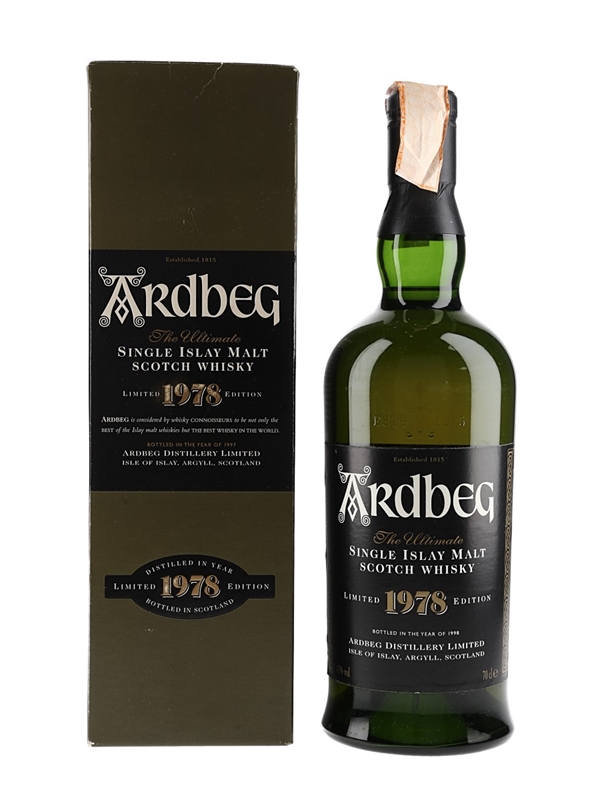 A limited edition bottle of Ardbeg 1978 The Ultimate Single Islay Malt Scotch Whisky, bottled in 1998. This was imported to the Italian market.