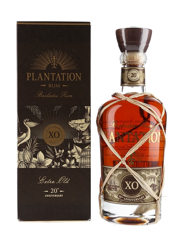 A bottle of Plantation XO rum produced in Barbados and bottled to commemorate the 20th anniversary of the brand. The rums are initially aged in the Caribbean in bourbon casks then shipped to the Charente (home of Plantation's owner, Cognac producer Pierre Ferrand) where they undergo a second maturation in small French oak casks.