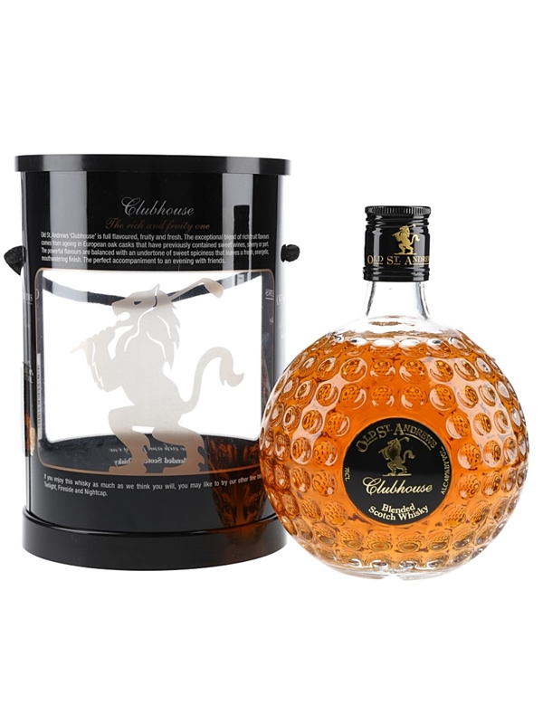 A bottle of Old St Andrews Clubhouse Blended Scotch Whisky. This is presented in a golf ball shaped bottle.
