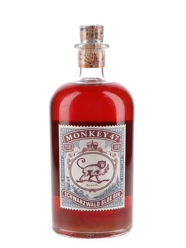 A 50cl bottle of Monkey 47 Schwarzwald Sloe Gin. This is distilled from 47 regional botanicals, and macerated with wild sloe berries from Germany's Black Forest. This was bottled from batch no. L07/2022. This one was produced in 2023.