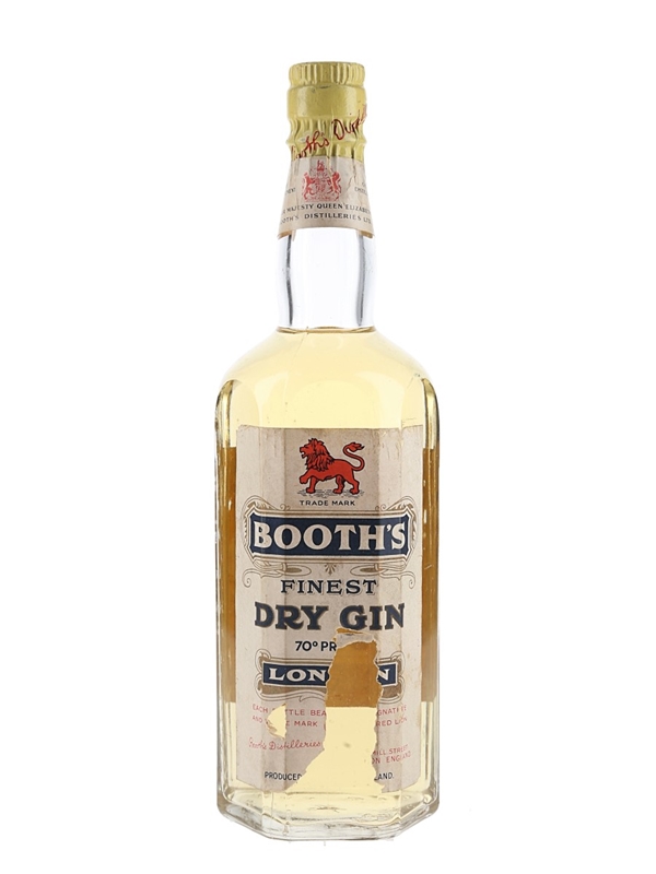 A bottle of Booth's Finest London Dry Gin. The back label carries certification from the Royal Institute of Public Health & Hygiene dated 1955, which leads us to estimate this bottle dates from the late 1950s.