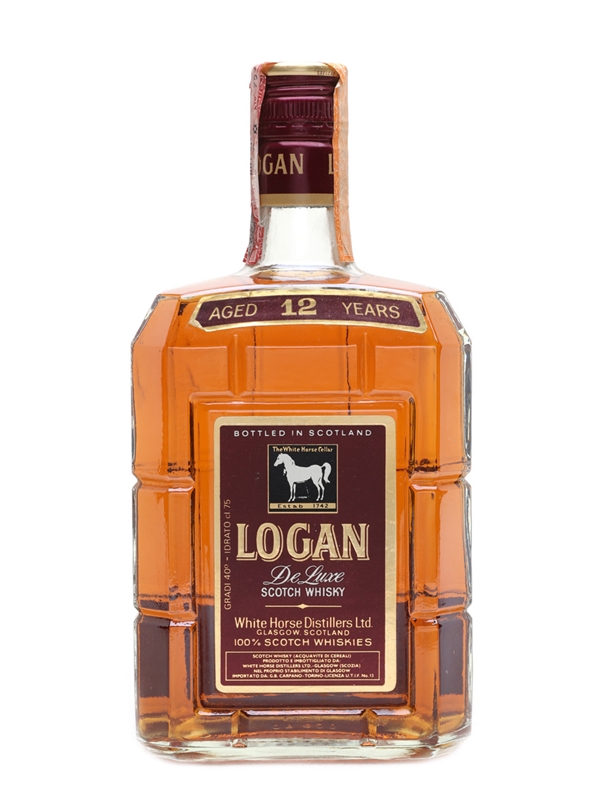 A bottle of Logan De Luxe 12 Year Old blended Scotch whisky, produced and bottled by White Horse Distillers. This was bottled for the Italian market and imported by Carpano, we estimate in the late 1970s.