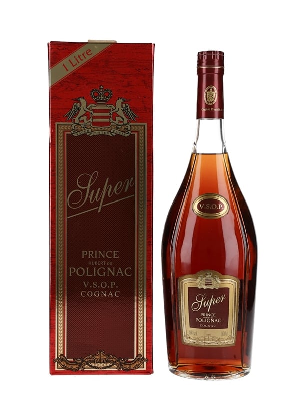 A litre bottle of Prince Hubert de Polignac Super VSOP Cognac bottled for Hong Kong Duty Free.