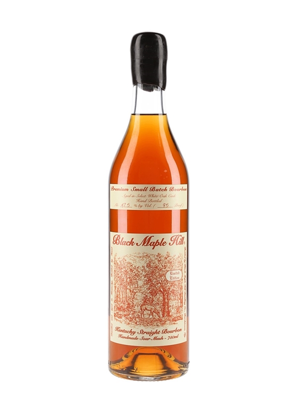 A limited edition bottle of Black Maple Hill Premium Small Batch Limited Edition Handmade Sour Mash Kentucky Straight Bourbon Whiskey, aged in Select White Oak casks and bottled at 47.5% ABV.