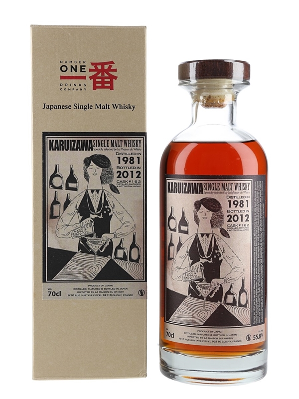 A bottle of Karuizawa 1981 Single Malt Japanese Whisky. This was distilled in 1981 and bottled in 2012 by Number One Drinks for French whisky merchant La Maison du Whisky as part of the Cocktail series labels.