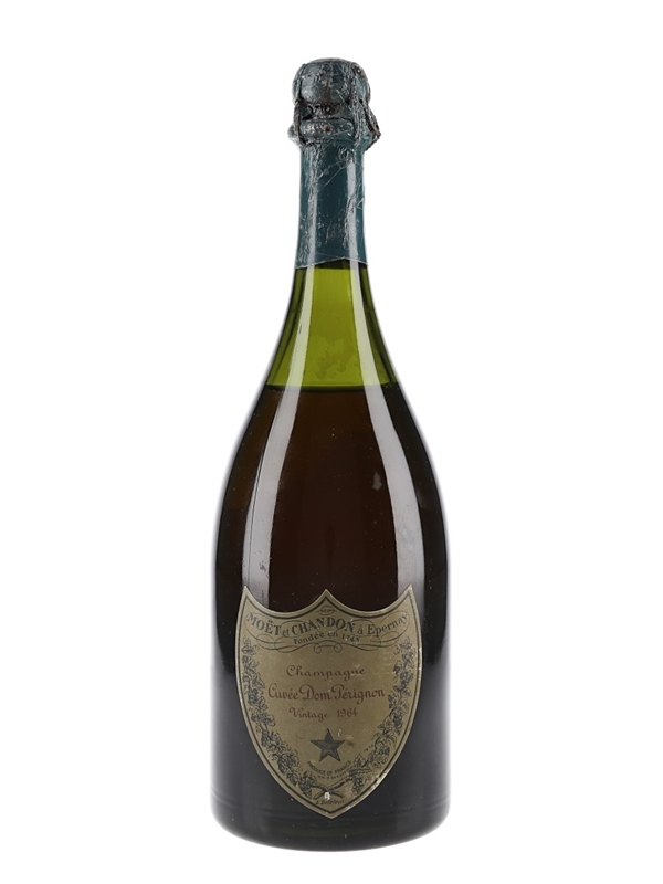 A bottle of Dom Pérignon 1964 vintage Champagne from Moët & Chandon, a 50% Pinot Noir and 50% Chardonnay blend.