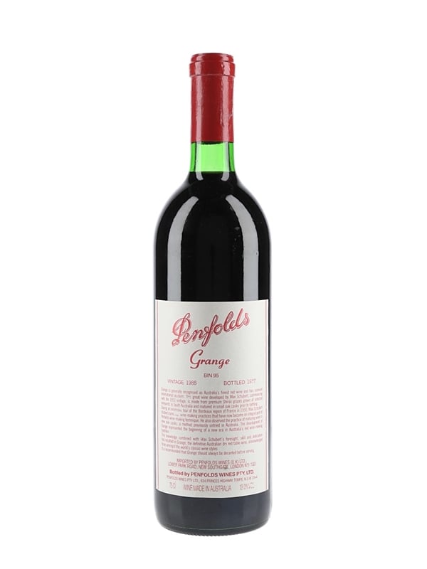 A bottle of 1985 Penfolds Grange, Bin 95, bottled in 1987.