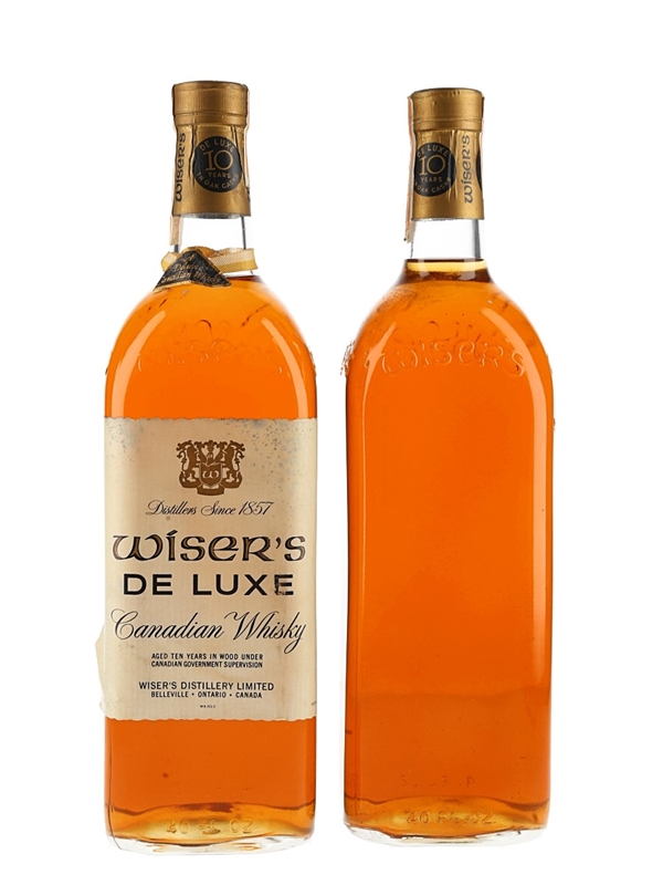 This lot contains two 113cl bottles of Wiser's 10 Year Old De Luxe Canadian Whisky. The tax strip reads 1955. This indicates that the youngest whisky in the bottle was distilled in 1955.