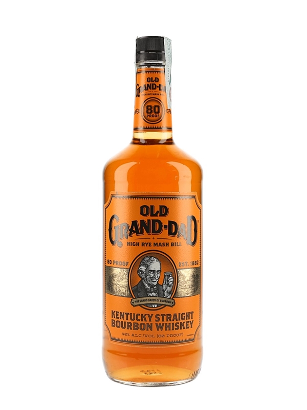 A litre bottle of Old Grand-Dad 80 Proof Kentucky straight bourbon whiskey. This was distilled and bottled by The Old Grand-Dad Distillery Co., Frankfort. This was imported to the Italian market, we estimate in the 1990s.