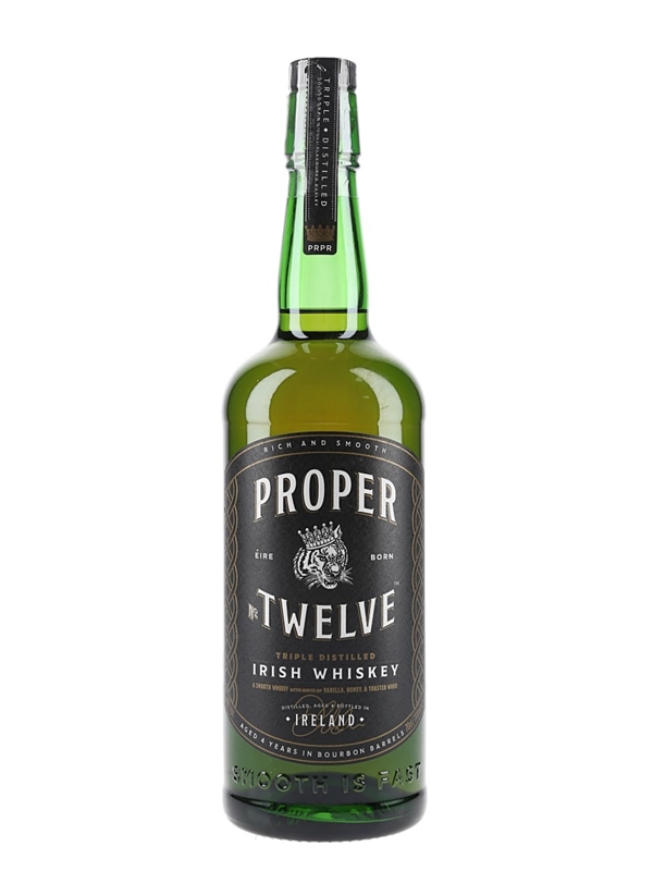 A bottle of Proper Twelve 4 Year Old Blended Irish Whiskey, produced in Ireland for JC Master Distribution Limited.