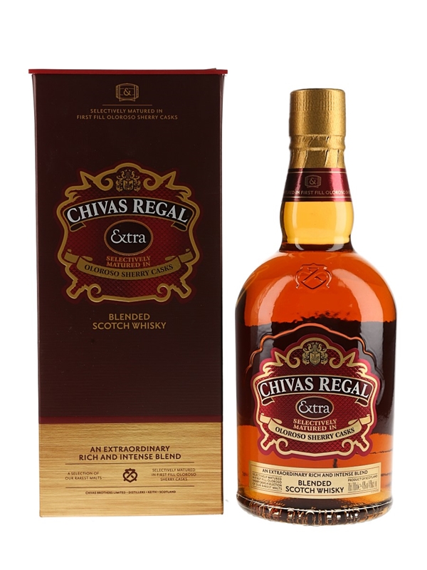 A bottle of Chivas Regal Extra Blended Scotch Whisky. This was created by Master Blender Colin Scott and includes malts matured in first fill oloroso sherry casks. The bottling code indicates this was bottled in 2018.