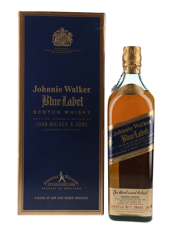A bottle of Johnnie Walker Blue Label, a super premium blend made from long-aged malt and grain whiskies. We estimate this was bottled in the early 1990s. This is bottle number U 28663 JW.