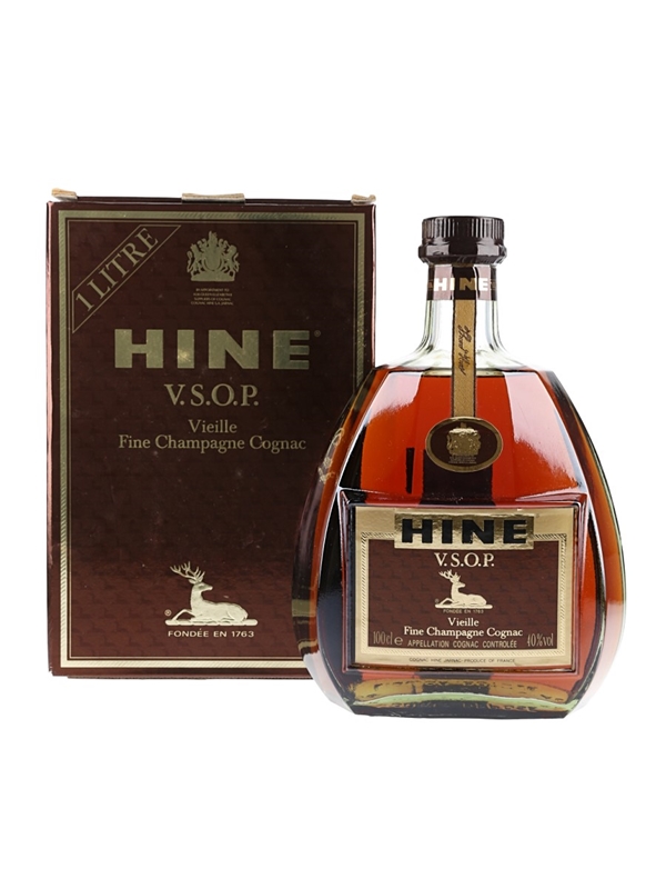 A litre bottle of Hine VSOP Vieille Fine Champagne Cognac. We estimate this was bottled in the 1980s.