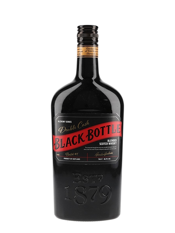 A bottle of Black Bottle Double Cask Blended Scotch Whisky produced by Gordon Graham & Company. This bottle is from batch number 1.