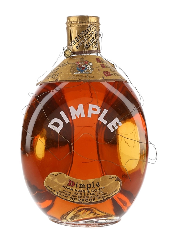A bottle of Haig's Dimple Old Blended Scotch Whisky, sealed with a spring cap closure. We estimate this was bottled in the 1950s to 1960s. The label carries a royal warrant by appointment to The Queen.