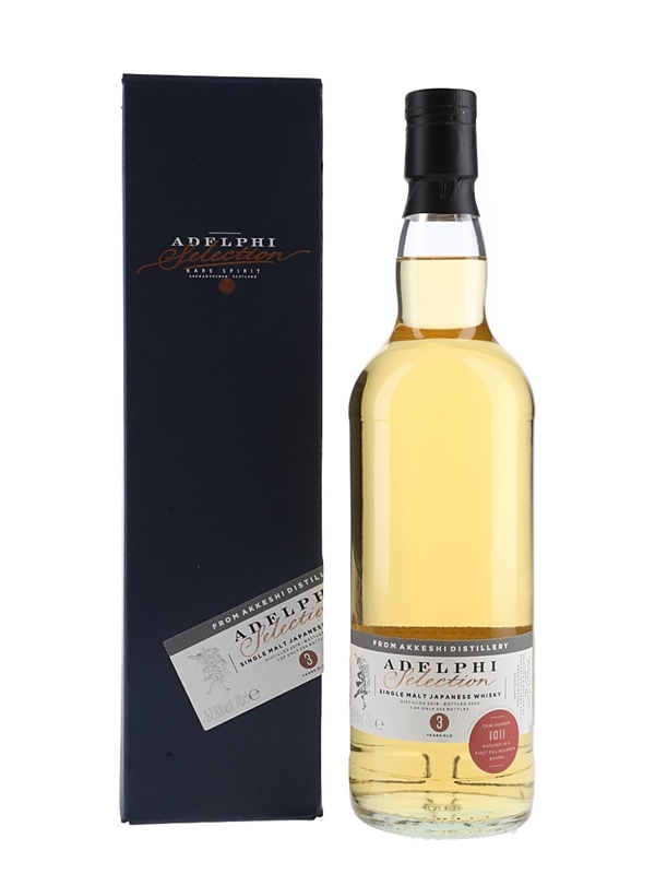 A bottle of Akkeshi 3 Year Old Japanese Whisky. This was distilled in 2018, matured in a single first fill Bourbon Barrel and bottled by Adelphi in 2023 to celebrate Adelphi's 30th Anniversary.