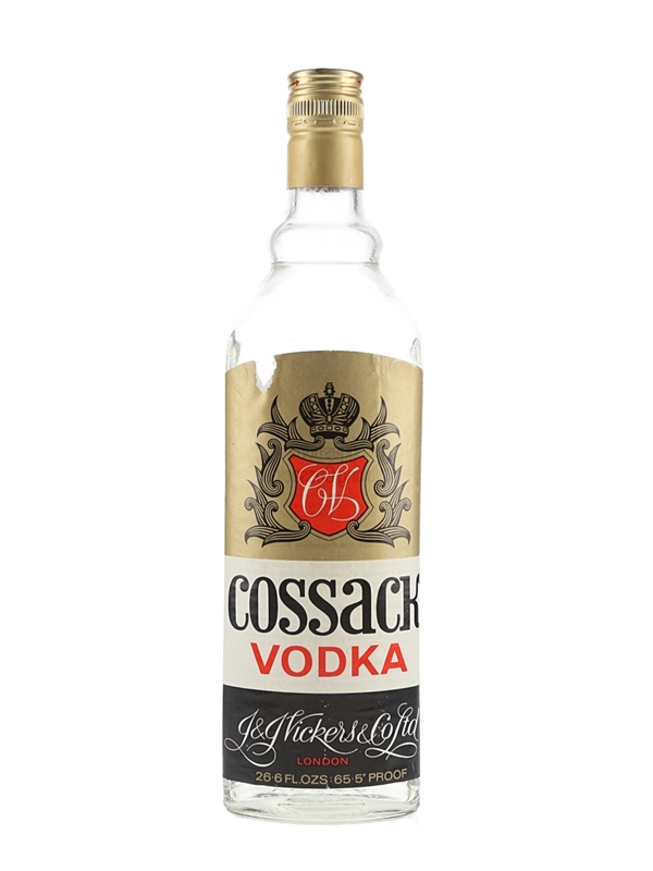 A bottle of Cossack vodka, produced in England by J & J Vickers & Co Ltd. of London. We estimate this was bottled in the 1970s.