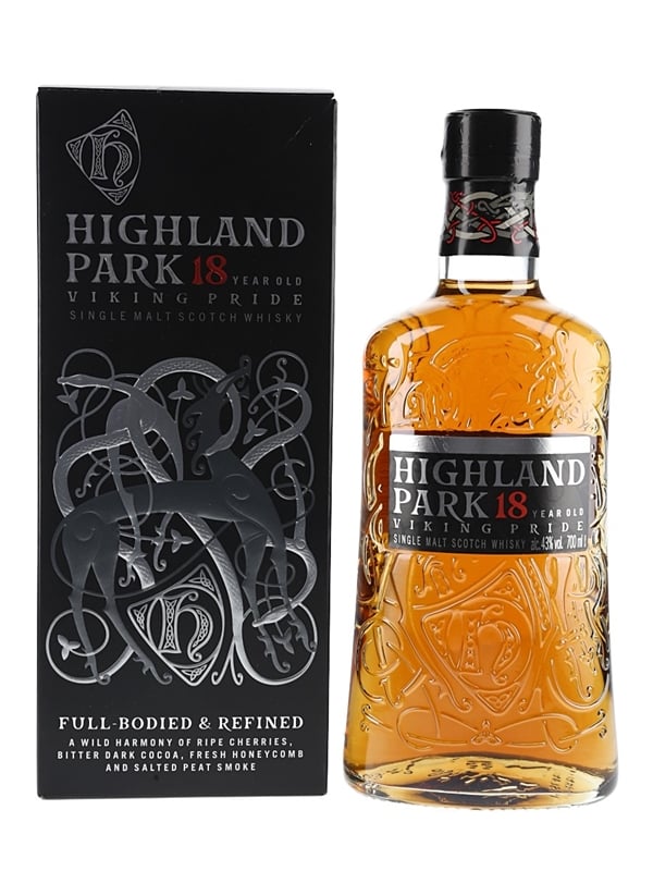 A bottle Highland Park 18 Year Old Viking Pride Single Malt Scotch Whisky, matured in a combination of first fill sherry seasoned European and American oak casks.
