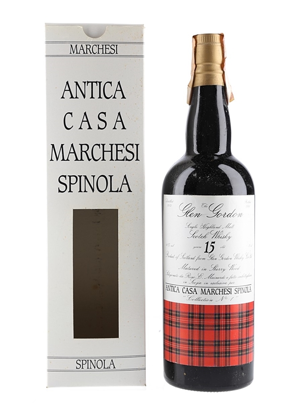 A bottle of Glen Gordon Single Highland Malt Scotch Whisky. This was distilled in 1974, matured in sherry wood and bottled in 1990 for the Antica Casa Marchesi Spinola Collection No.1. This was imported to the Italian market by Sestante Import.