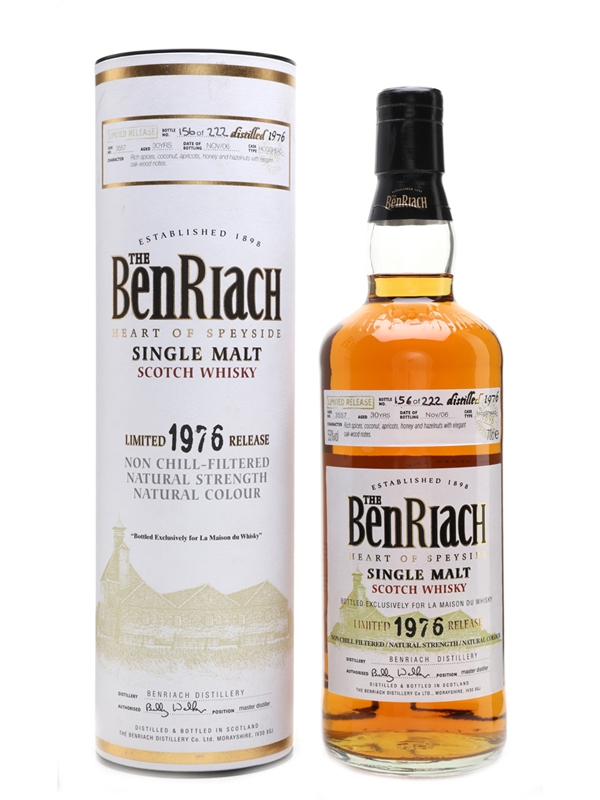 A bottle of Benriach 30 Year Old. This was distilled in 1976, matured in a single hogshead and bottled in 2006 exclusively for La Maison du Whisky
