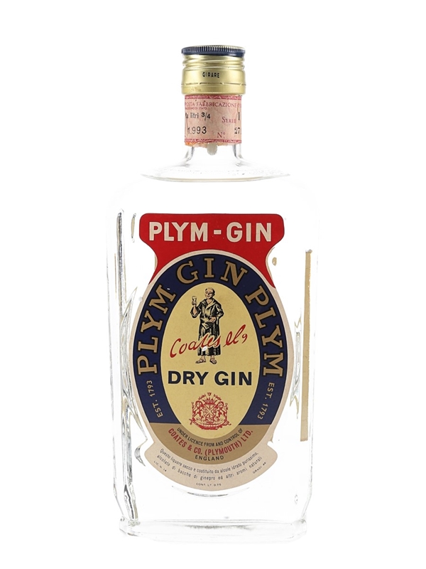A bottle of Plym-Gin, a dry Plymouth gin. This was produced in Italy by Stock, under licence from and control of Coates & Co. We estimate this was bottled in the 1960s to 1970s.