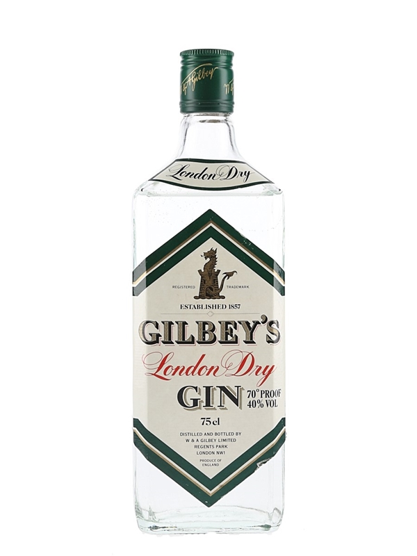 A bottle of Gilbey's London Dry Gin, distilled and bottled by W & A Gilbey Ltd., we estimate in the 1980s.