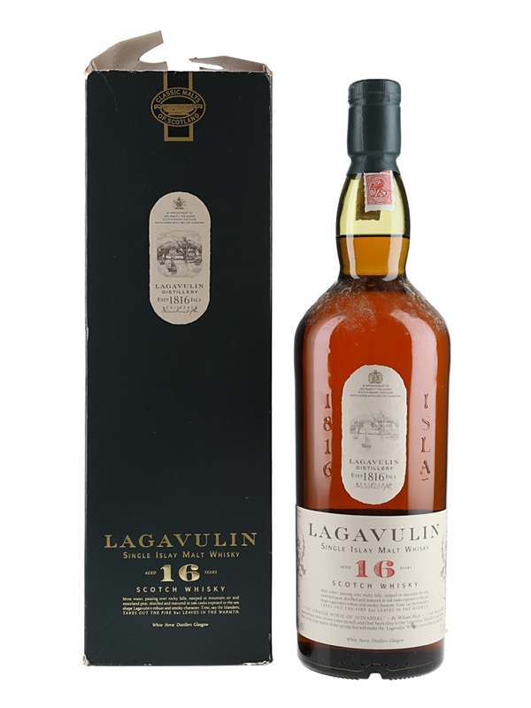 A litre bottle of Lagavulin 16 Year Old Single Islay Malt Scotch Whisky, part of Diageo's Classic Malts of Scotland range. We estimate this was bottled in the 1990s, when the distillery was still owned by White Horse Distillers.