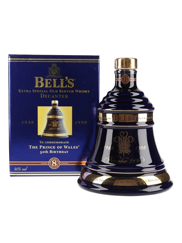A bottle of Bell's 8 Year Old Extra Special Old Scotch Whisky produced by Arthur Bell & Sons, presented in a Wade porcelain decanter and released to celebrate The Prince of Wales' 50th birthday on 14 November 1998.