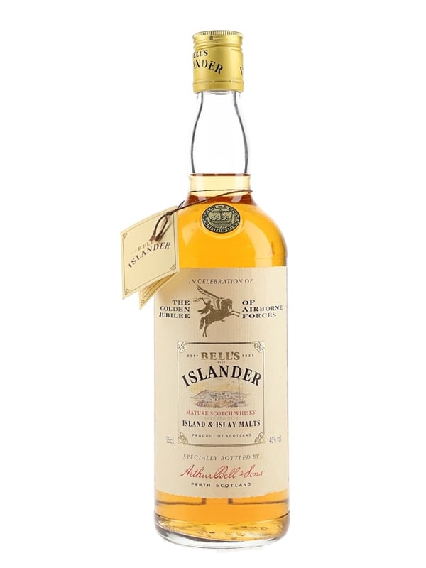 A bottle of Bell's Islander Mature Scotch Whisky. This is a blend made mostly from Islay and Island malts and was bottled to celebrate The Golden Jubilee of Airborne Forces. We estimate this was bottled in the 1980s.