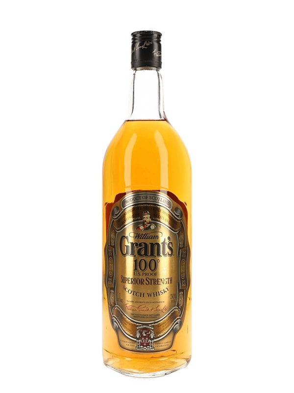 A litre bottle of Grant's 100 Proof Superior Strength Scotch Whisky.